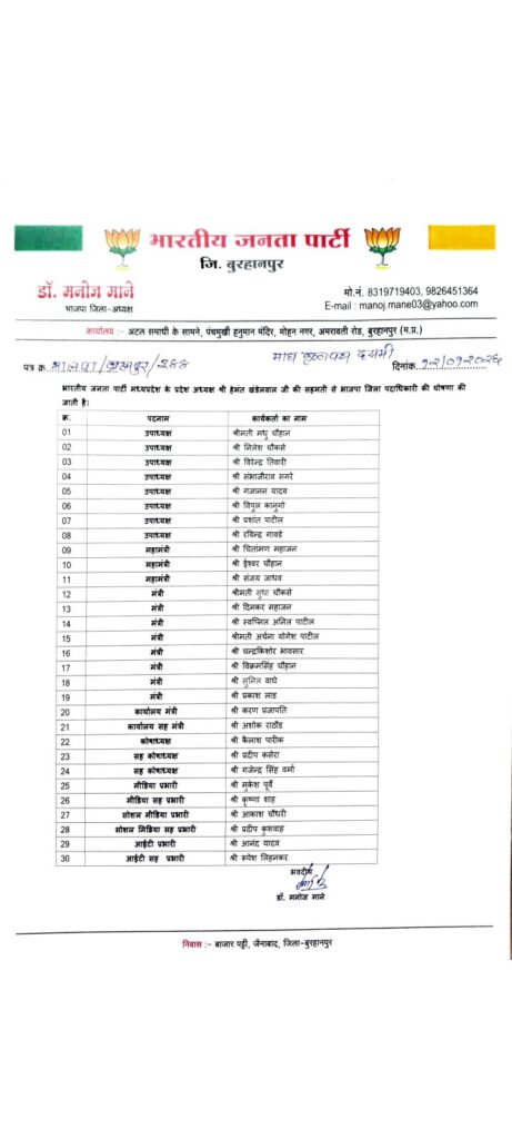 बुरहानपुर जिला भाजपा की नई कार्यकारिणी की घोषणा